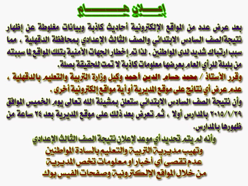 | ظهرت الان نتيجة الشهادة الاعداديه بمحافظة الدقهليه للترم الاول 2015 | مديرية التربيه والتعليم |