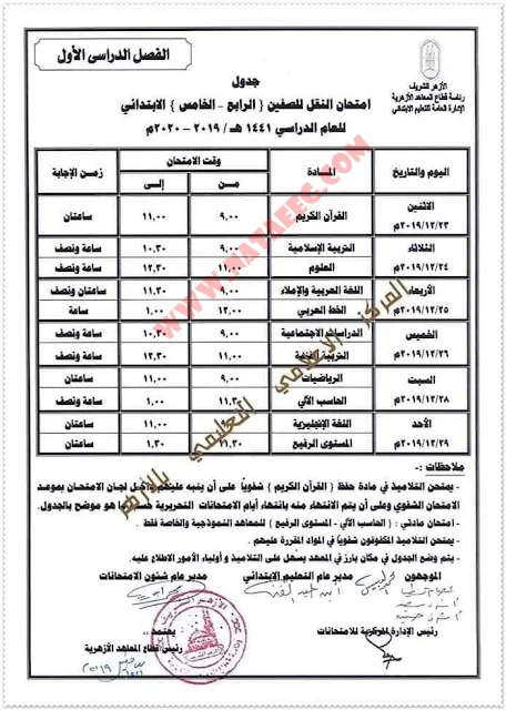 جدول امتحانات الصف الثالث الابتدائى الازهرى الفصل الدراسى الاول