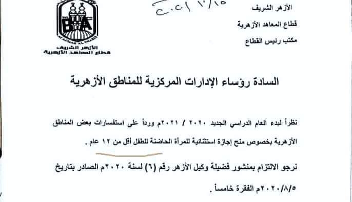 اصدر فضيلة شيخ الازهر احمد الطيب قرار بمناسبة بدء العام الدراسى الجديد 2020/2021 وردا على استفسارات بعض المناطق الازهرية بخصوص منح اجازة استثنائية للمرأة الحاضنه للطفل اقل 12 عام نرجو الالتزام بمنشور فضيلة وكيل الازهر رقم 6 لسنه 2020 الصادر بتاريخ 5/8/2020 الفقرة الخامسة بمنح الموظفه الحضانه لطفل اقل من ١٢ عام اجازه استثنائية تجدد شهريا مع تكليفهن بالعمل من المنزل