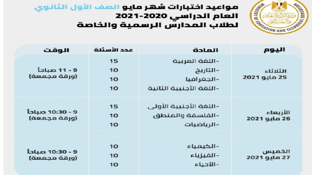 - يعقد لطلاب الصفين الأول والثاني الثانوي امتحانين مجمعين في نهاية شهر أبريل ونهاية شهر مايو بالمدرسة بلجان مؤمنة ومراقبة ويكون الامتحان ورقياً (اختيار من متعدد في ورقة مجمعة للجدول المرفق) على أن تكون الإجابة بورقة منفصلة (بابل شيت).