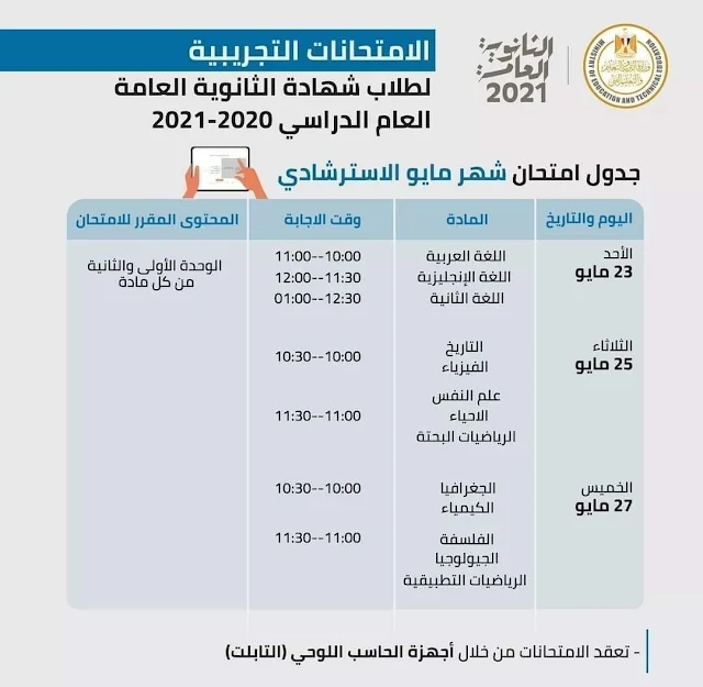 طلبة الصف الثالث الثانوى للتذكره الامتحان التجريبي يوم الاحد القادم ٢٣مايو والثلاثاء ٢٥والخميس ٢٧وبرجاء الالتزام بالجدول والإجراءات الاحترازية وارتداء الكمامه وضرورة شحن شريحة التابلت رصيد حتى ولو ب٥جنيه وكذلك شحن التابلت وللعلم الامتحان سيكون حتى مارس ٢٠٢١والحضور مهم للتدريب علي الاسئلة الحديثه وخالص الدعوات بالتوفيق لكل الطلاب والله الموفق أرق تحيات ادارة مدرسة بلقاس الثانوية للبنات بالتوفيق والنجاح والتمييز كلل الله جهدكم بالنجاح إن شاء