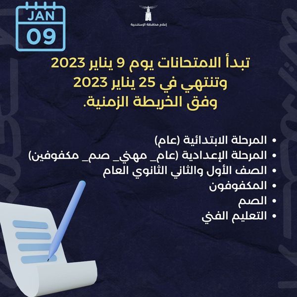 مواعيد امتحانات الفصل الدراسي الأول للعام الدراسي 2022/ 2023 لسنوات النقل بالتعليم العام والتعليم الفني والشهادة الإعدادية بعد اعتمادها من اللواء /محمد الشريف محافظ_الإسكندريةتبدأ الامتحانات يوم 9 يناير 2023 وتنتهي في 25 يناير 2023 وفق الخريطة الزمنية.