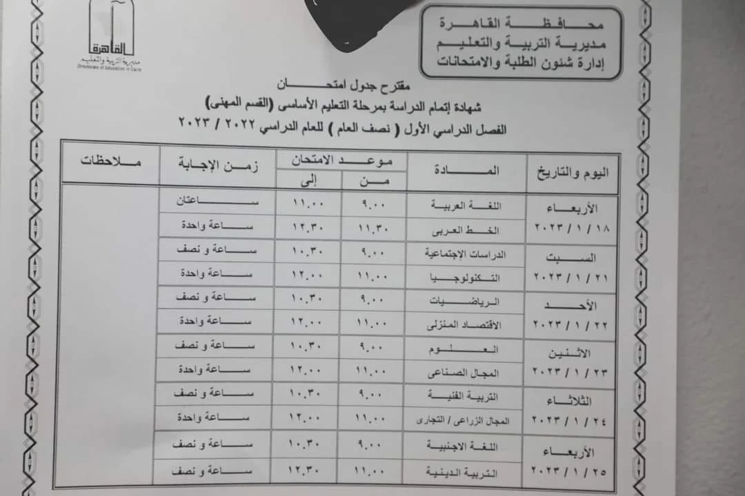 محافظه القاهره: مقترح جدول امتحانات شهادة إتمام الدراسة بمرحلة التعليم الأساسي (القسم المهني) الفصل الدراسي الأول ( نصف العام ) للعام الدراسي ۲۰۲۲ / ۲۰۲۳