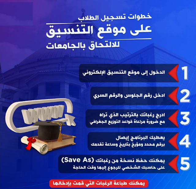 لطلاب المرحلة الأولي للتنسيق ...خطوات تسجيل الطلاب علي موقع تنسيق القبول بالجامعات المصرية